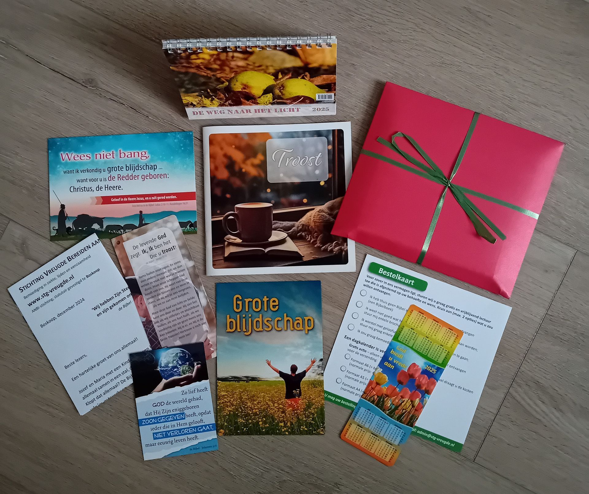 Wilt u één of meer pakjes bestellen om aan het eind van het jaar onder zieken, ouderen en anderen vreugde, troost en bemoediging door het Evangelie te verspreiden? Bestel dan elk jaar via het onderstaande formulier. U kunt deze eindejaarspakjes het hele jaar door bestellen, maar de uitlevering vindt altijd in december plaats.